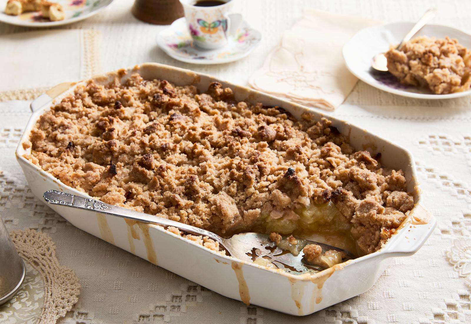 “My maternal grandmother has a weekly pre-Shabbat tradition of serving her famous apple crumble, ka’ak, and coffee to everyone who stops by,” shares Sylvia Fallas. “It’s a beautiful and casual tradition that even my 2 year old adores.” Her grandmother Renee’s classic apple crumble recipe combines apples with a bit of lemon juice, which get topped with copious amounts of a buttery, toasty crumble.