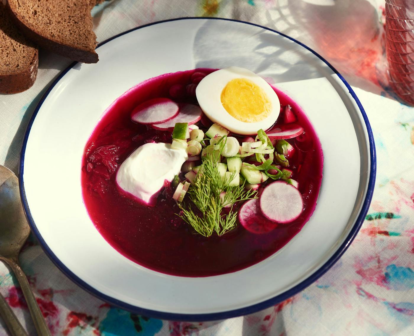 During the summer, there was always a deep purple borscht called svekolnik served cold. Crunchy kirby cucumbers, scallions, and radishes make it extra refreshing. Her mother always stored a batch in the fridge in an enamel pot adorned with flowers. The pot kept the soup “ice cold,” Sasha says, “and had the secret double duty of also looking much more ‘Russian’ in the fridge next to some of the American groceries. [It] was always the one I wanted the most.”