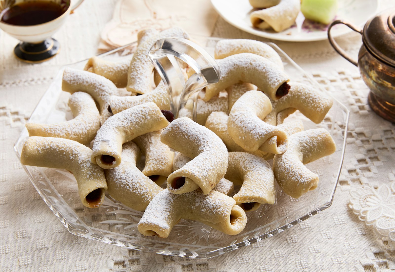 In Sylvia Fallas’s family, Friday afternoons are for coffee and cake at her maternal grandmother Renee’s house. Before Shabbat, everyone gathers for sweet treats, including these dainty date adjwe cookies. Made with a semolina dough and filled with a caramel-like mixture of dates, the adjwe are rolled out thinly and shaped into crescents. Achieving “a thinner dough is a sign of skill,” Sylvia says. Since the cookies are labor intensive, Sylvia makes several batches of adjwe at a time, freezing the shaped, unbaked cookies on cookie sheets and transferring them to ziploc bags when they’re frozen solid. You can bake the cookies directly from the freezer, adding an extra minute or two to the bake time. “It also helps the cookie retain its crescent shape,” explains Sylvia.