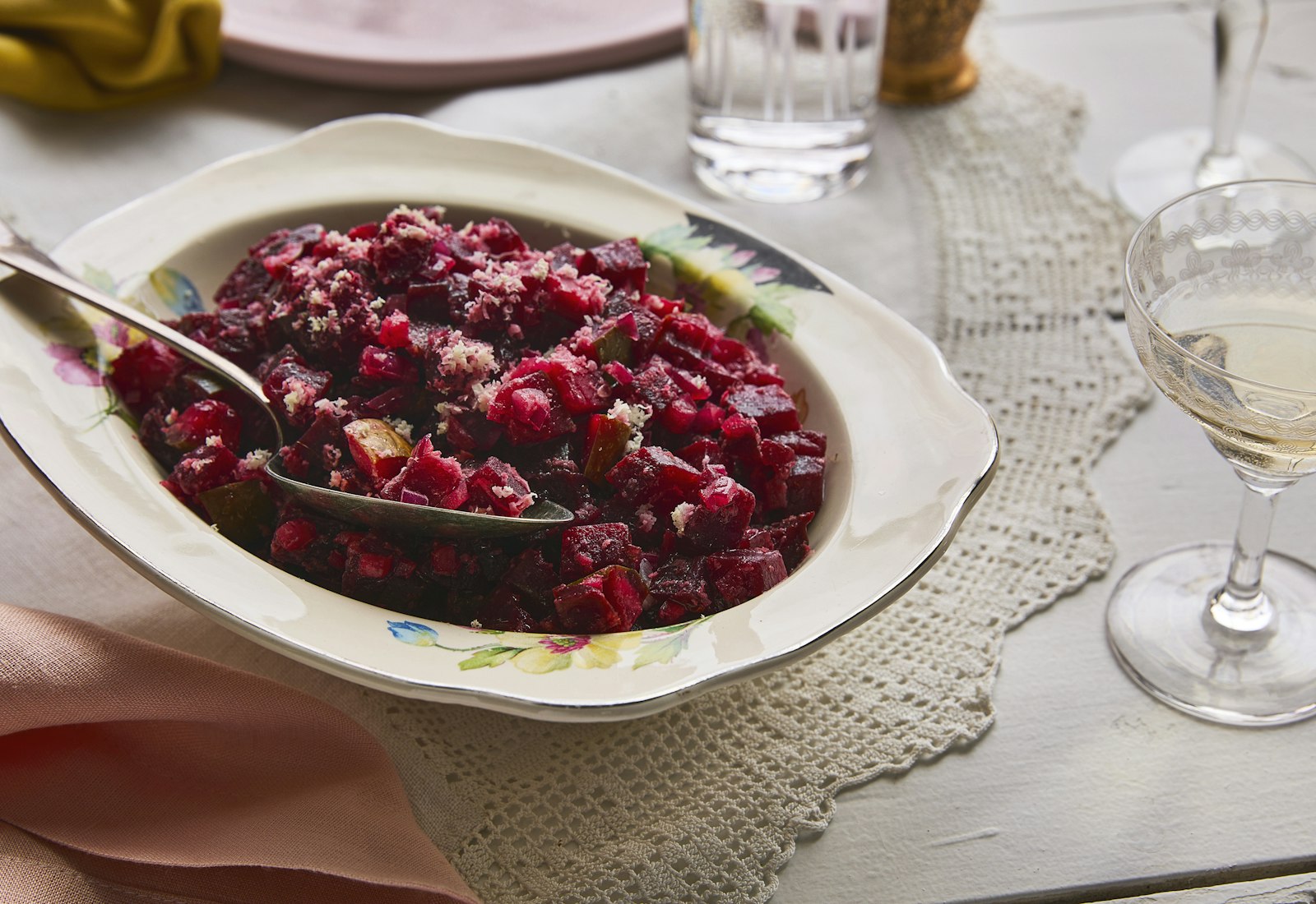 “Beetroot and pickled or fermented cucumber are an indisputable classic of Eastern European and Ashkenazi cuisines,” shares cookbook author Alissa Timoshkina, who was raised in Siberia in an apartment her family shared with her great-grandmother Rosalia. “You could find either, or often both, in Rosalia’s kitchen on any given day, so a version of beet-and-pickle relish was never far off; all it took was a bit of chopping, and there you had a salad. This wonderful recipe was shared with me for the ‘Kapusta’ cookbook by a Ukrainian food historian Olga Koutseridi.”