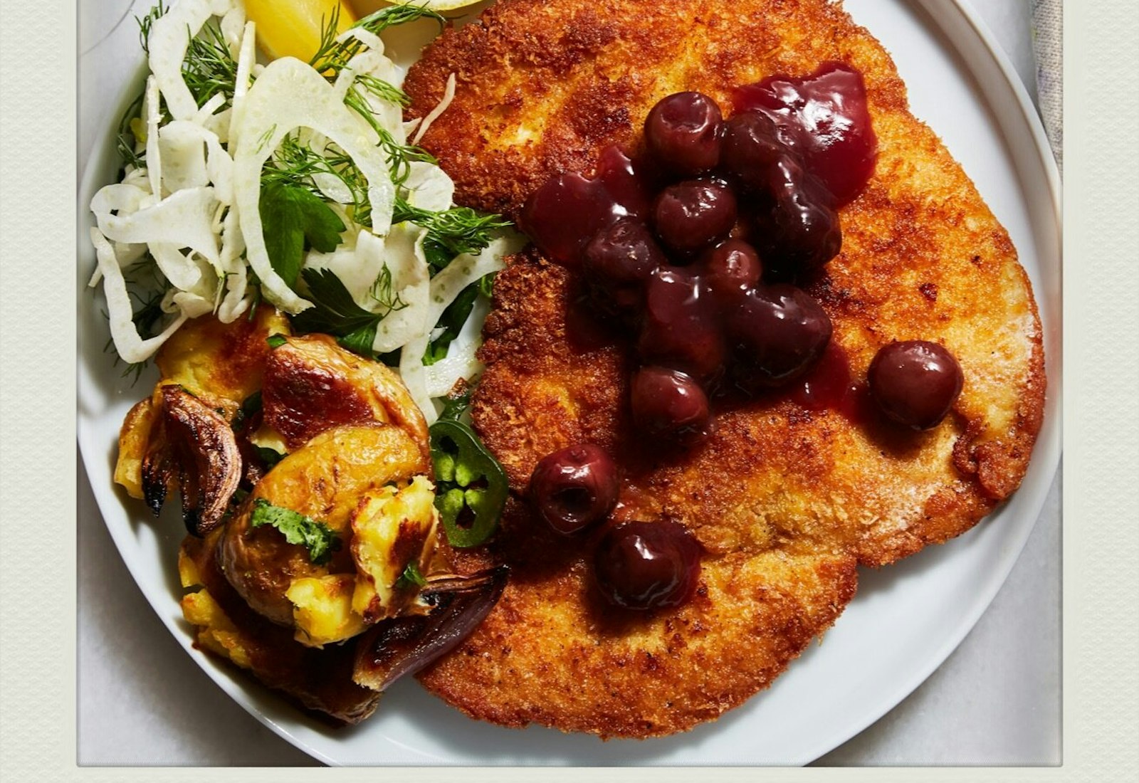 Serve the schnitzel hot with a dollop of warm cherry sauce.