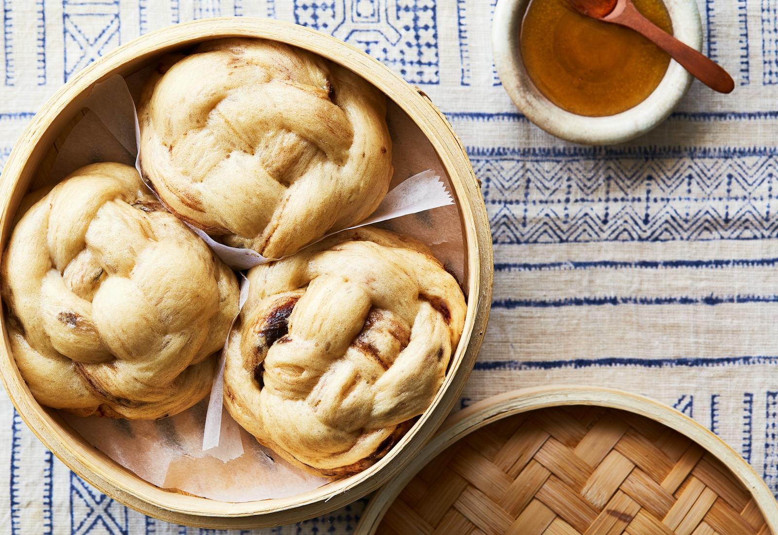 Inspired by the Jewish New Year tradition of eating round challahs, Jamie Wei braids her mantou into beautiful round buns and studs them with sticky-sweet dates for an extra sweet touch.