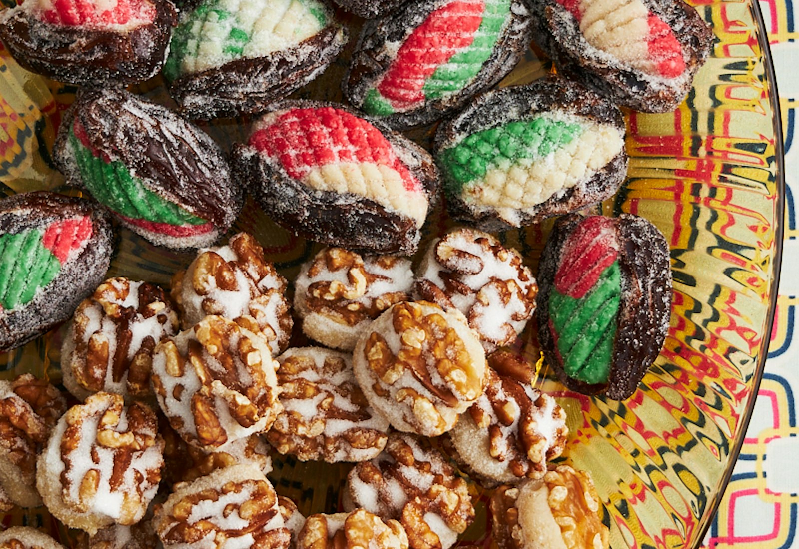 Make the dates: Slit open one side of a date with a paring knife and remove the pit. Fill with a generous ½ teaspoon each of two of the three colors of marzipan. Mold the marzipan so it fills the date nicely, then use the back of a knife to make a design in the paste by pressing indentations into it. Use the back of a knife to make a design with indentations (get creative)! Repeat with the remaining dates.