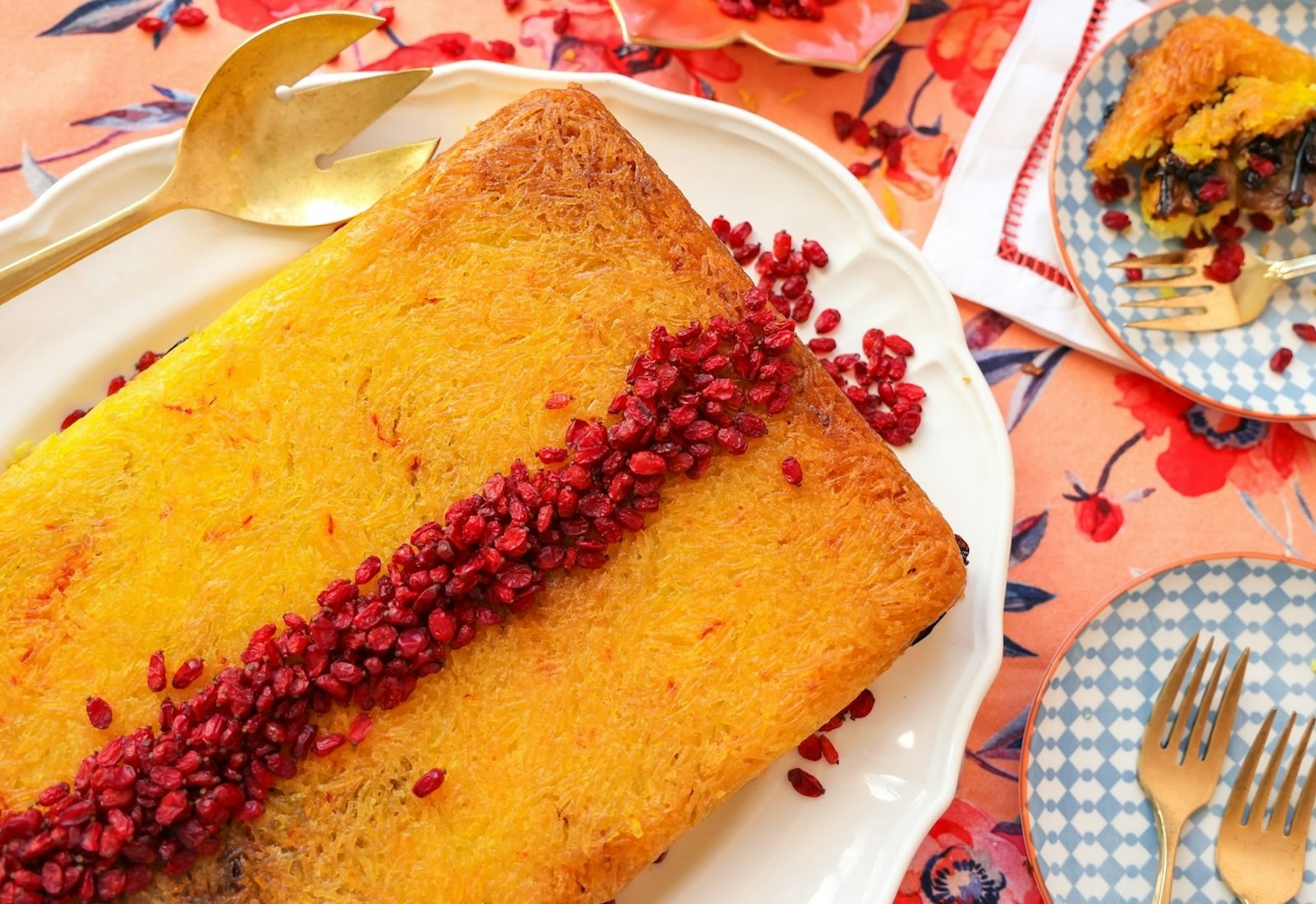 Persian tachin is a cherished Shabbat dish in Substacker (and former JFS team member) Arielle Nir’s family. Deeply golden on the bottom, fragrant with saffron, and studded with sweet-tart barberries, the rice and eggplant casserole is made to be shared. Arielle and her twin sister Danielle Nir Sultan taught us how to make it in the Grandmas Tent at The Great Nosh, a 2,000 person picnic we hosted in June 2025 in New York City.