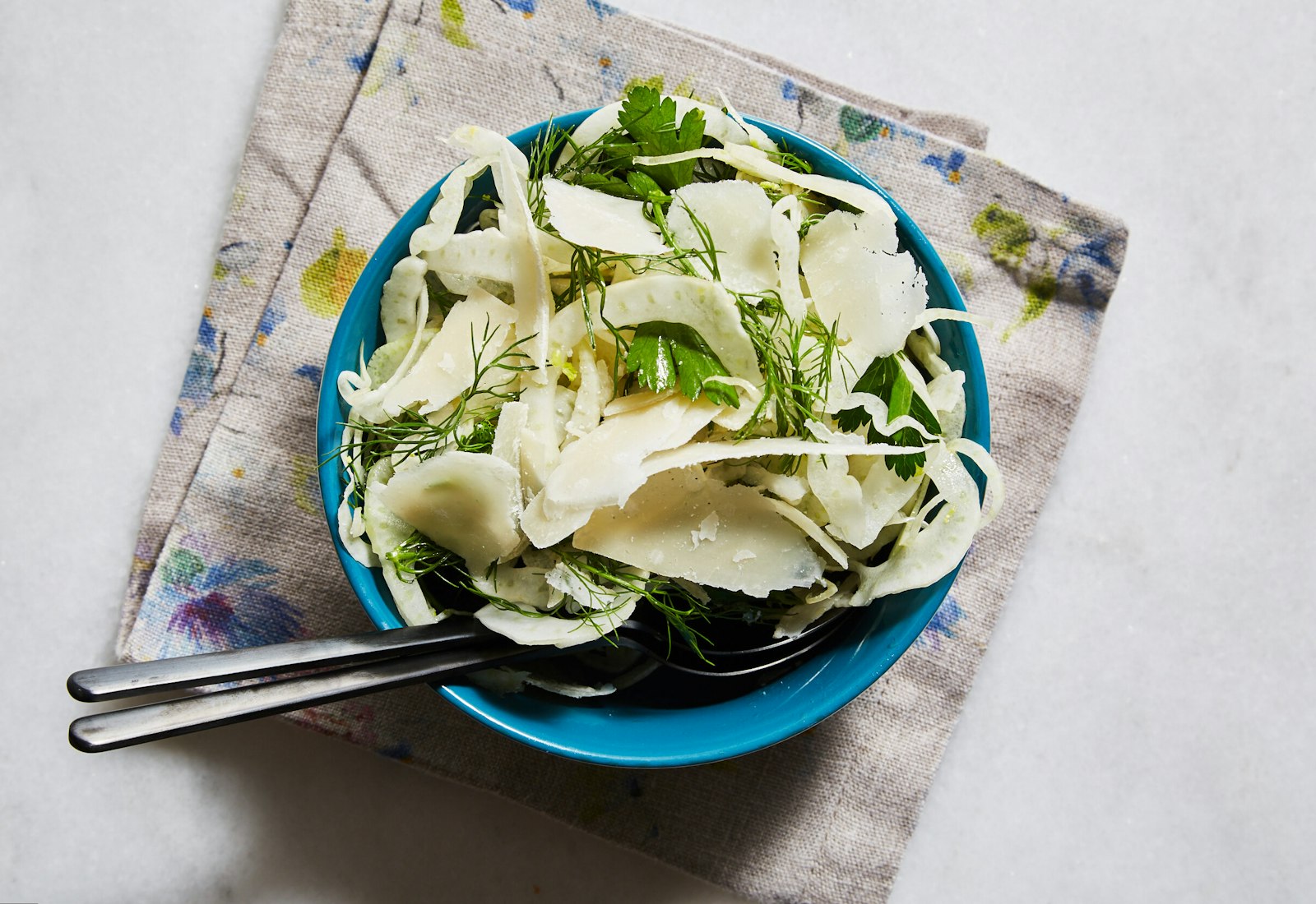 This crunchy shaved fennel salad from Seed + Mill co-owner Rachel Simon is loaded with fresh herbs for a bright touch. She serves it alongside crunchy chicken schnitzel with cherries, which her mother Jane made for Shabbat dinner when Rachel was a kid. “Friday night, that’s the anchor to my Judaism,” Rachel explains.