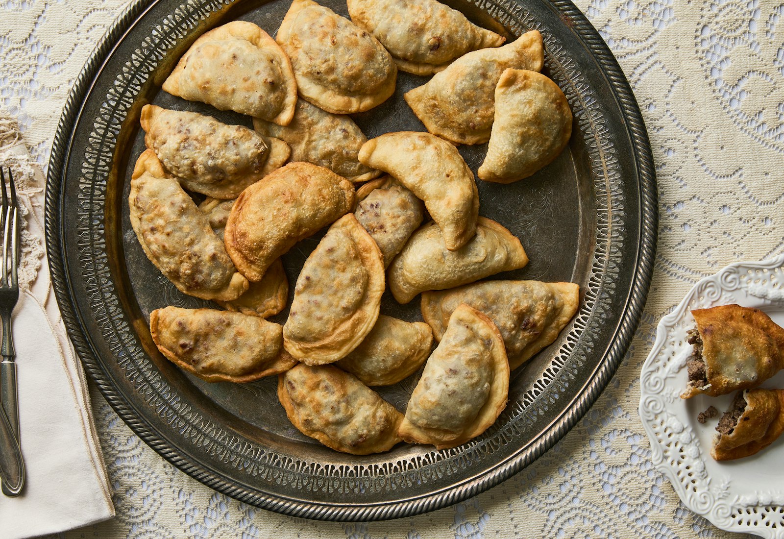 Place 1½–2 tablespoons of filling in each circle. Fold into a half-moon shape, leaving a ½-inch border. Press edges to seal. Arrange the sambousak on a parchment-lined tray, leaving a small space between them so they don’t stick to one another.