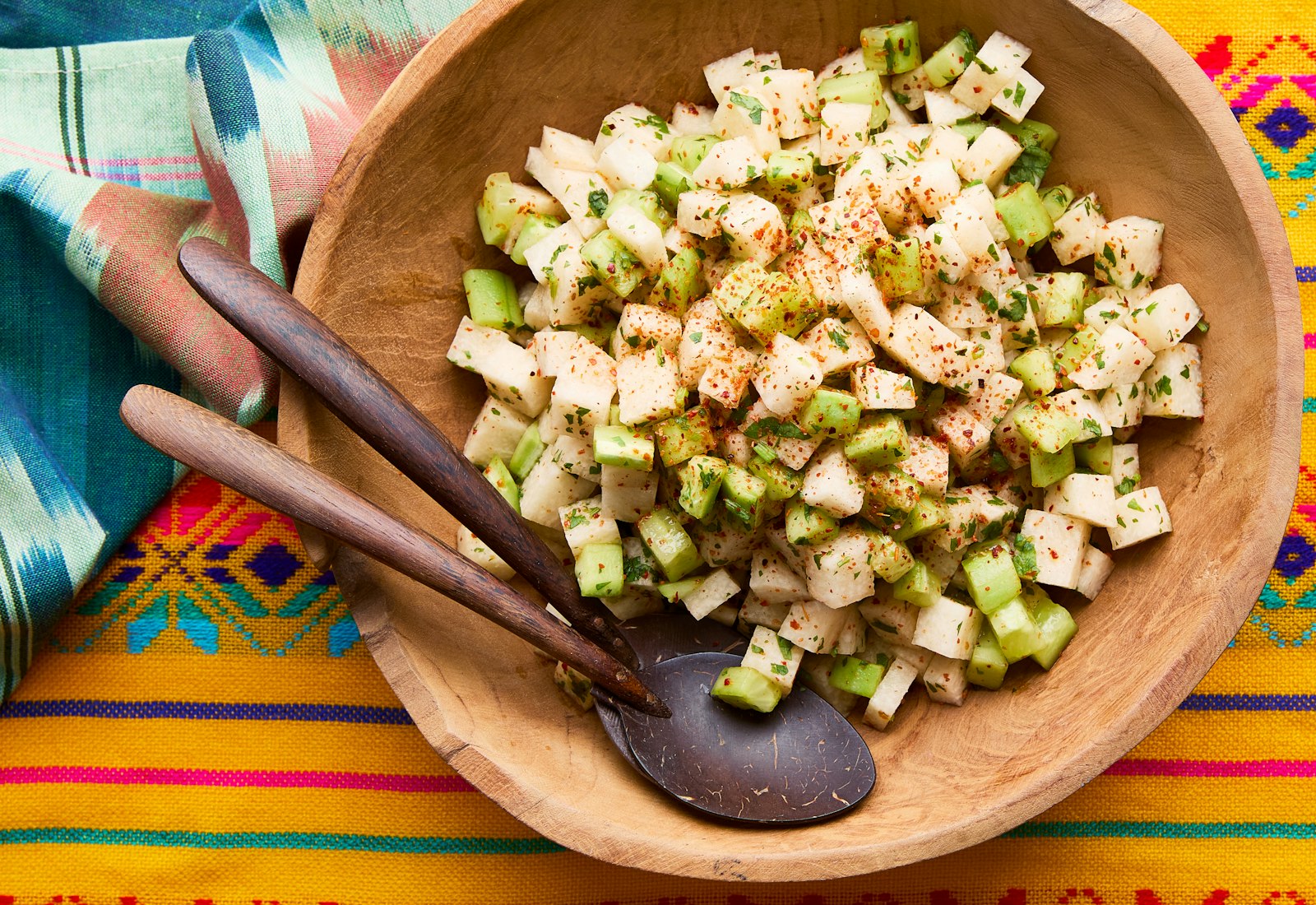 In a mixing bowl, combine the jicamas, cucumbers, cilantro, lime juice, chile powder, and salt.