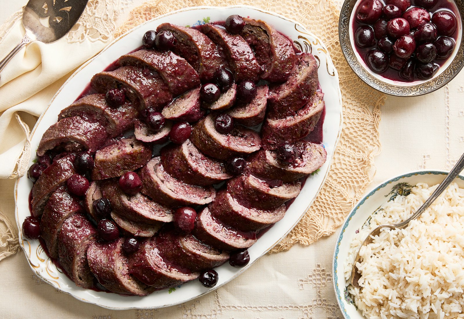 Kibbe dough, a malleable mixture of chopped meat and rice ground together, forms the basis of this popular Syrian dish. The dough surrounds a layer of ground meat flavored with celery and allspice and gets neatly rolled up, like a jelly roll. The rolls are braised in a tangy, tart sauce of tamarind, canned sweet cherries, lemon and sugar.