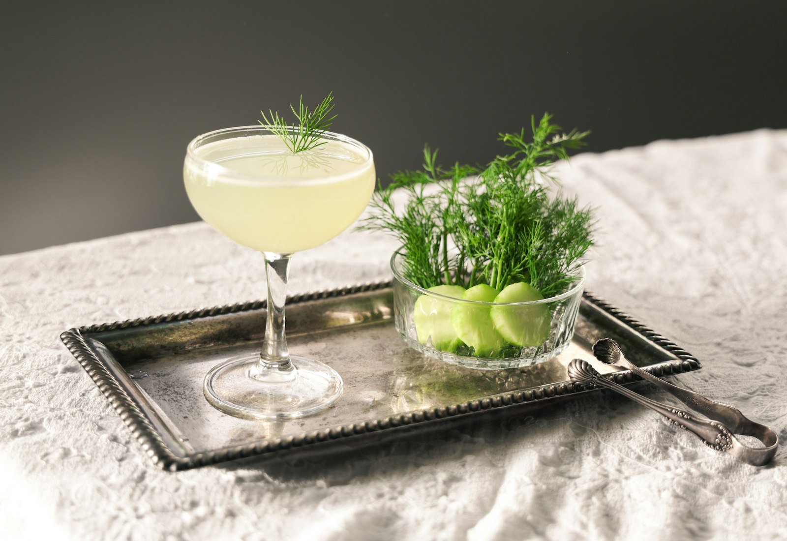 Pour the ice from the coupe. Strain the cocktail through a fine-mesh sieve into the chilled coupe and garnish with a dill leaf.