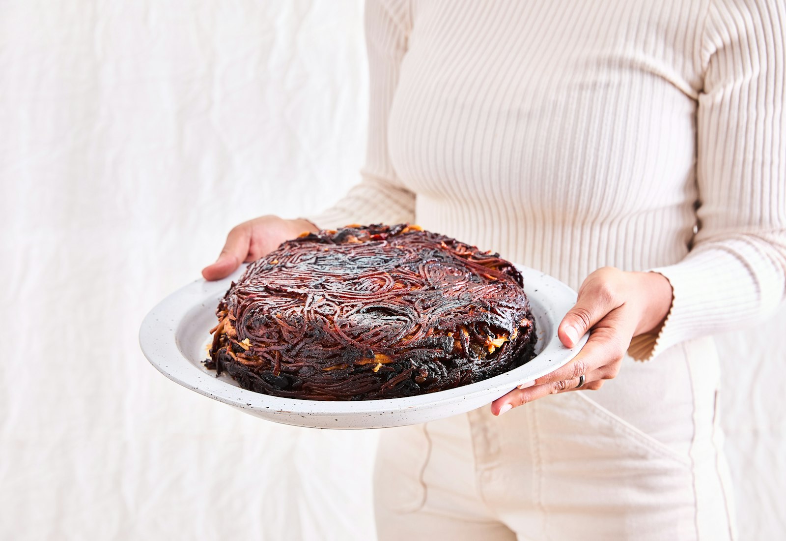 This macaroni hamin often appeared on the Yadid family Shabbat table. Also known as “Jerusalem hamin,” it’s believed to have originated in the Old Yishuv, the pre-Zionist Jewish communities of Jerusalem. A comforting Shabbat classic, it combines tender chicken with golden, lightly charred noodles. Like any hamin, time is the main ingredient, but this version cooks significantly faster than the Yadid family’s hamin with rice-stuffed steak and kuklas (bread dumplings). In just six hours, it develops fall-off-the-bone chicken and a deeply caramelized pasta bottom that everyone fights over.