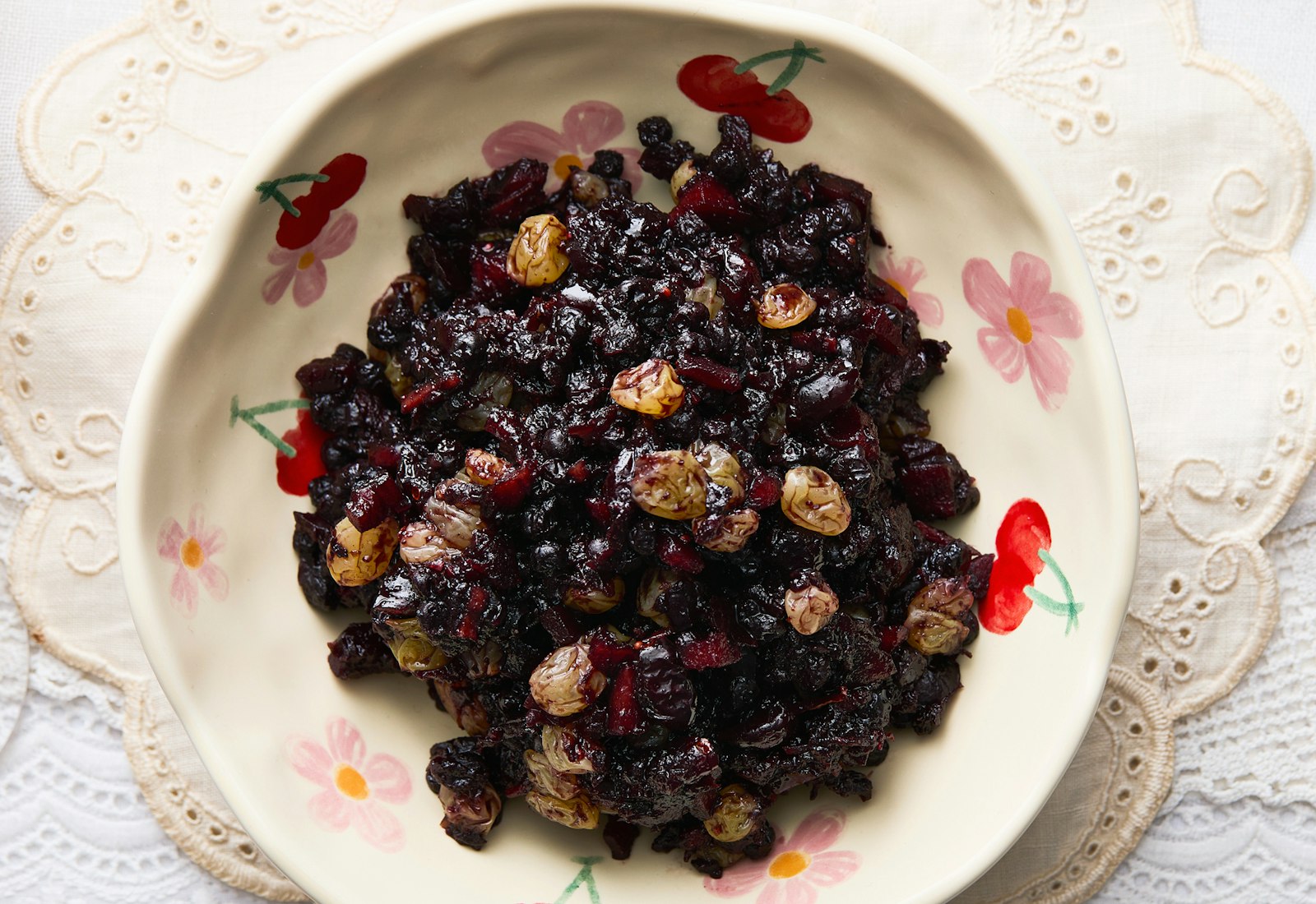 Judy Stein and her late husband Mike started collecting charoset recipes in the 1970s. One year, at their home in Maine, they shared several charosets and discussed how each reflected the ingredients various Jewish communities had access to — chestnuts in Venice, coconuts in Suriname, dried figs and dates in Yemen. That prompted a conversation about what would belong in a Maine charoset. They settled on blueberries and cranberries, which are grown in the state. Over the years, they added maple syrup, apples, and red wine vinegar for balance. The result is a sweet-and-sour charoset that perfectly captures the flavors of Maine. Judy first shared this recipe in Joan Nathan’s “King Solomon’s Table: A Culinary Exploration of Jewish Cooking From Around the World."