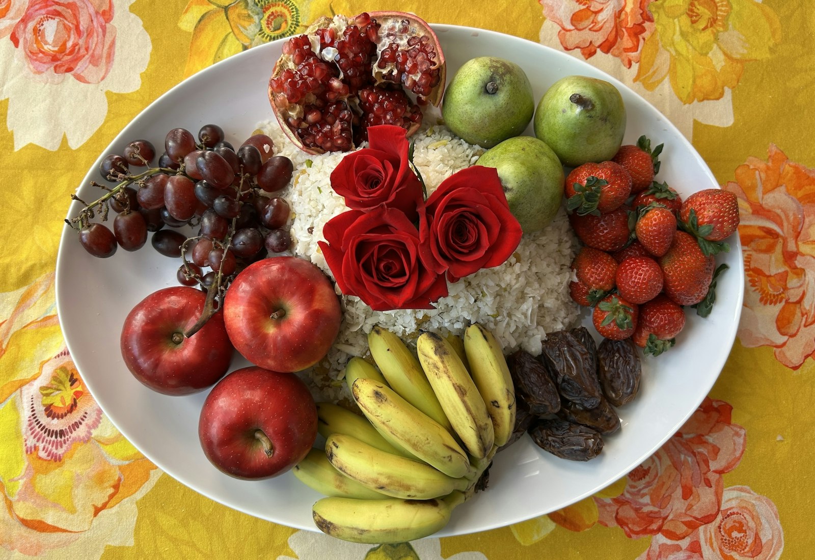 On Tu B’Shvat (known as the “New Year of the trees”), malida is enjoyed at home with family. When Eddna was growing up, she lived with her father’s aunt Yerusha who would prepare it for the holiday. Customarily, it’s decorated with flowers and 5, 7, or 9 different fruits to mark the start of the season of fruits. “And during the Malida ceremony, my mother, aunts, and grandmother would place a plain white cloth or men's shirt under the plate as a sign of purity,” she adds.
