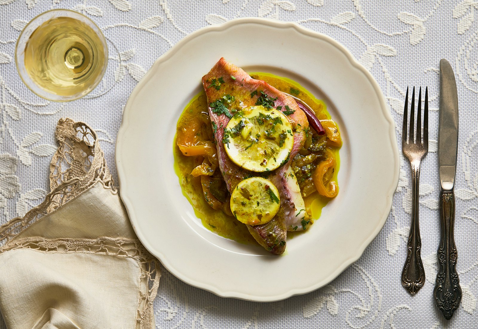 Red snapper fillets are gently simmered in the aromatic base until tender, then topped with lemon slices and fresh cilantro. Traditionally, this dish is served as its own course before the main meal, offering a light, flavorful start to the holiday meal.
