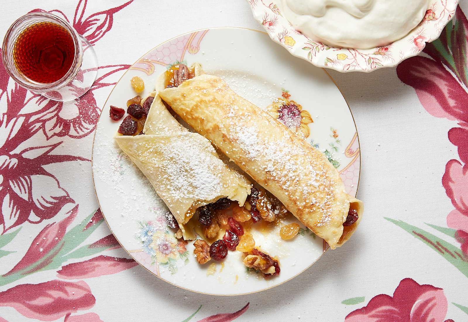 To recreate the palacsinta at Agi’s Counter, gently crumple the crepe to form peaks and valleys. Top it with sticky fig jam, a slice of cold butter, and a dusting of icing sugar. For a more traditional plating, fill the crepes with desired fillings and roll into logs. Finish with a dollop of sour cream and/or whipped cream and powdered sugar.