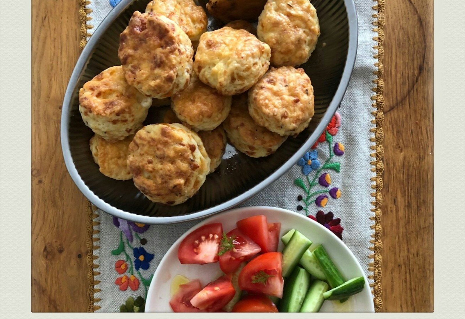 Roll out the dough to a rectangle that is about ¾ inch thick. Use a 2 to 3 inch cookie cutter or the edge of a cup to cut out circles of the dough. Place the cut pieces of the dough onto a parchment lined baking sheet. Gather the dough scraps, and reroll the dough to ¾ inches thick. Cut out the remaining pieces of dough and transfer to the baking sheet. Brush the top surface of all the pieces of dough with a beaten egg. Transfer to the oven and bake for about 20 minutes or until the pastries are golden brown.