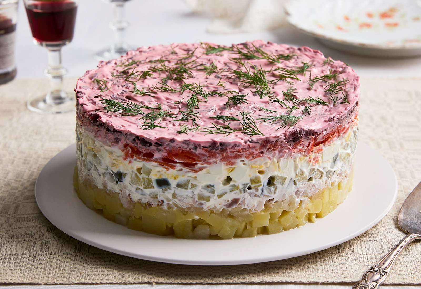 To serve, remove the mold from the sides of the shuba by slowly lifting it up with both hands. Garnish with fresh dill and serve cold.