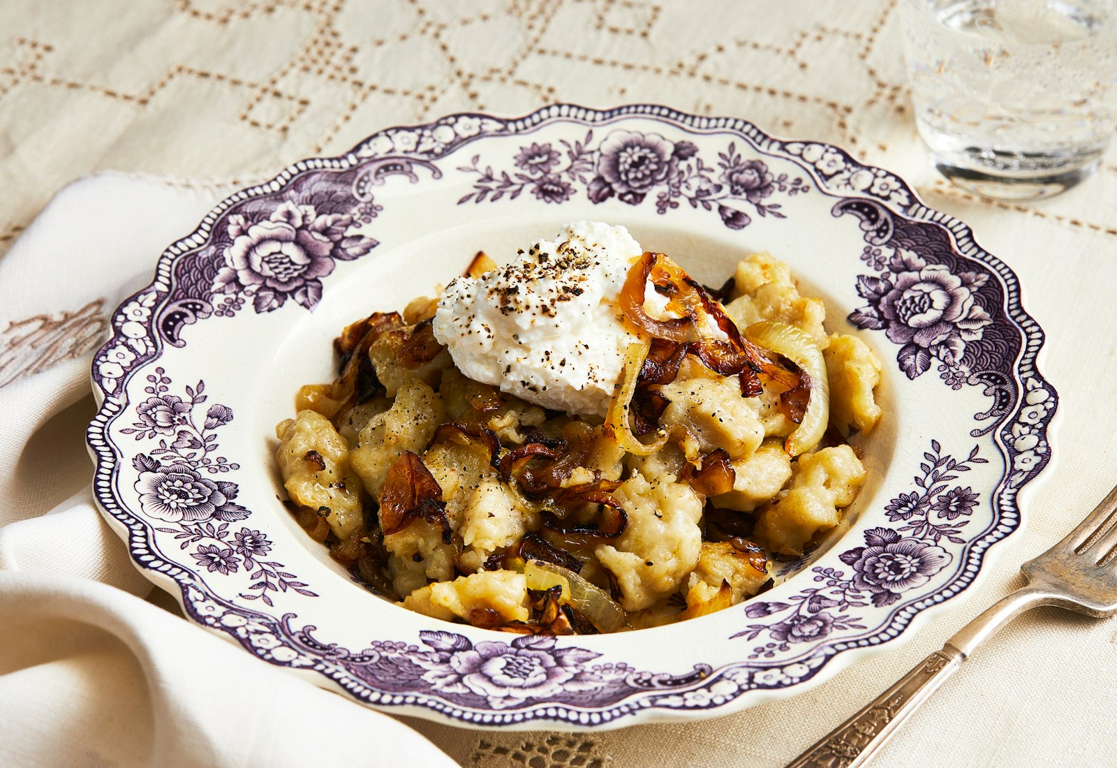 To serve, divide the strapačky between bowls; top with mounds of farmer’s cheese, sauteed onions and season with salt and freshly ground black pepper to taste.