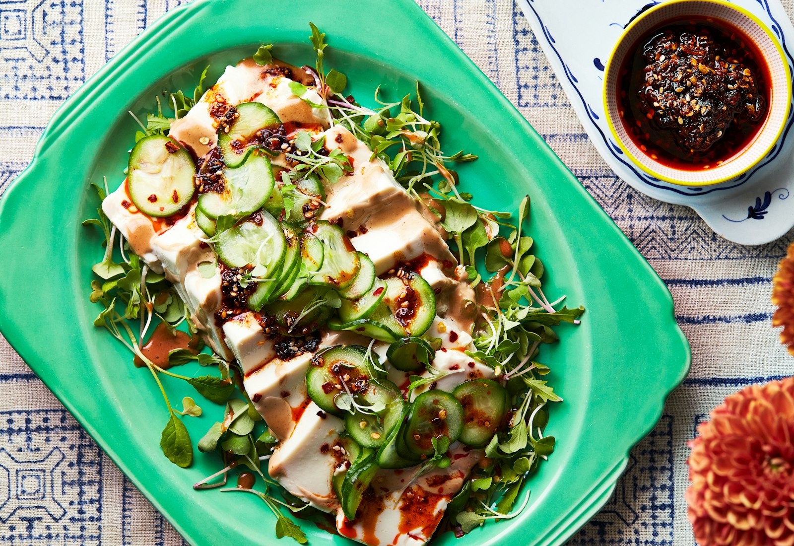 Carefully transfer the tofu slices on top of the greens. Place some pickled cucumber onto the platter. Top with chili crisp and more microgreens. Serve.