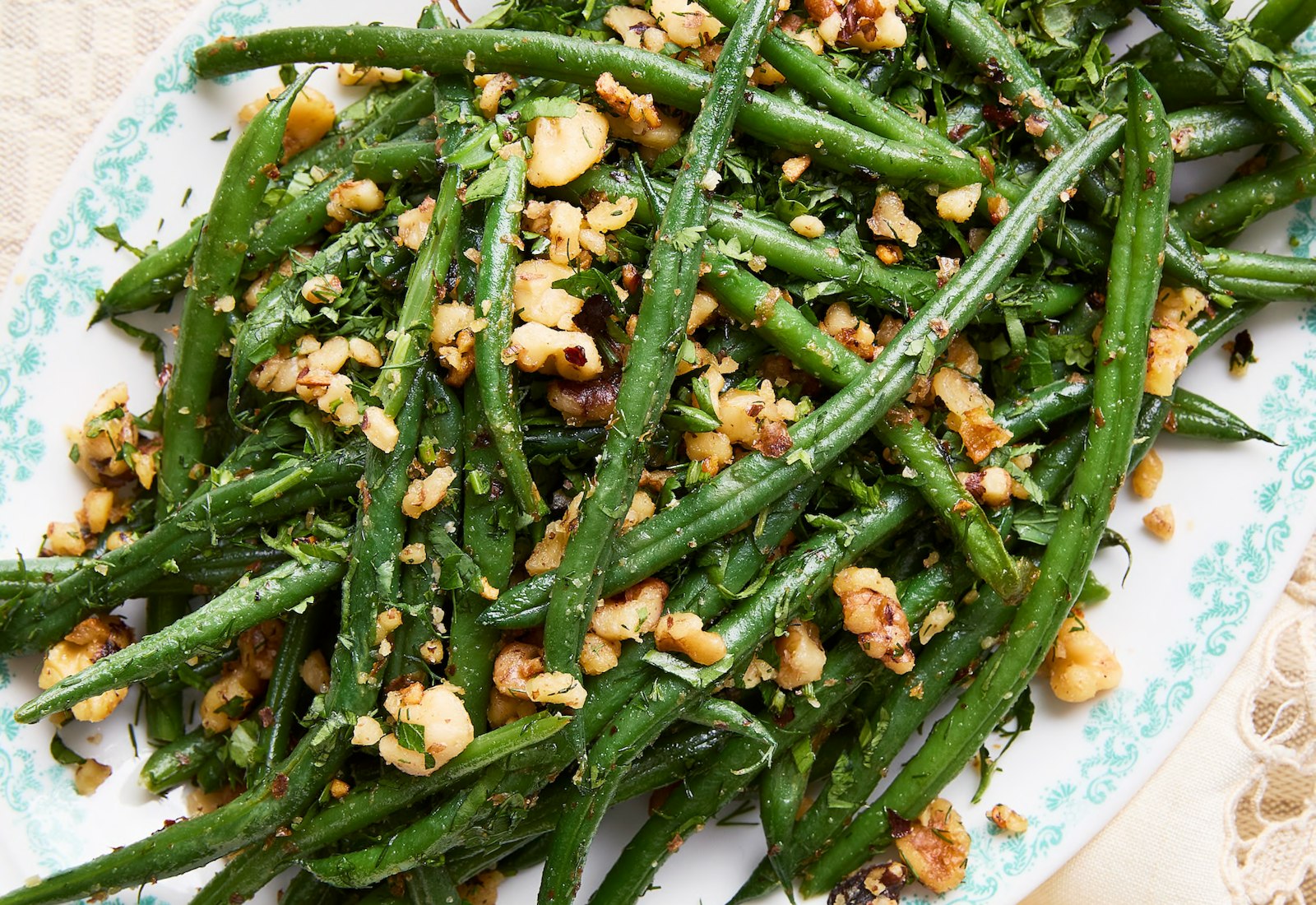 “Lobio means 'beans' in Georgian and refers to many types of bean dishes that originate in the Caucuses, including hot kidney bean stew, mashed cold pastes of beans and nuts, and green bean sides,” shares Elliot Fonarev. In his family, lobio refers to a side dish using green beans made with eggs or nuts. This walnut version is vinegary, and works well as a side to his rich lamb plov.