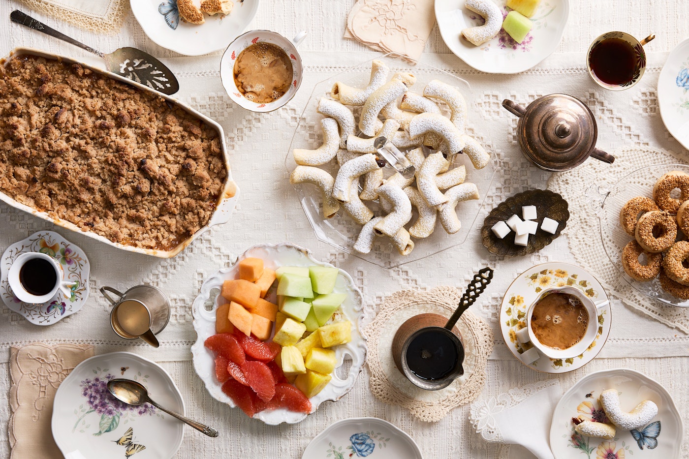 Still, gathering on Friday afternoons is an important tradition in Sylvia’s family. “It's like a weekly pre-Shabbat catch-up,” she says. Even in her 80s, Sylvia’s grandmother Renee hosts the entire family before Shabbat for coffee made in a stovetop percolator and a showcase of Syrian pastries (instead of a savory mazza spread). Her grandmother bakes tiny biscuits flavored with anise called ka’ak, adjwe or semolina cookies filled with sweet dates, as well as more American sweets like blueberry cake and the apple crumble she is famous for.
