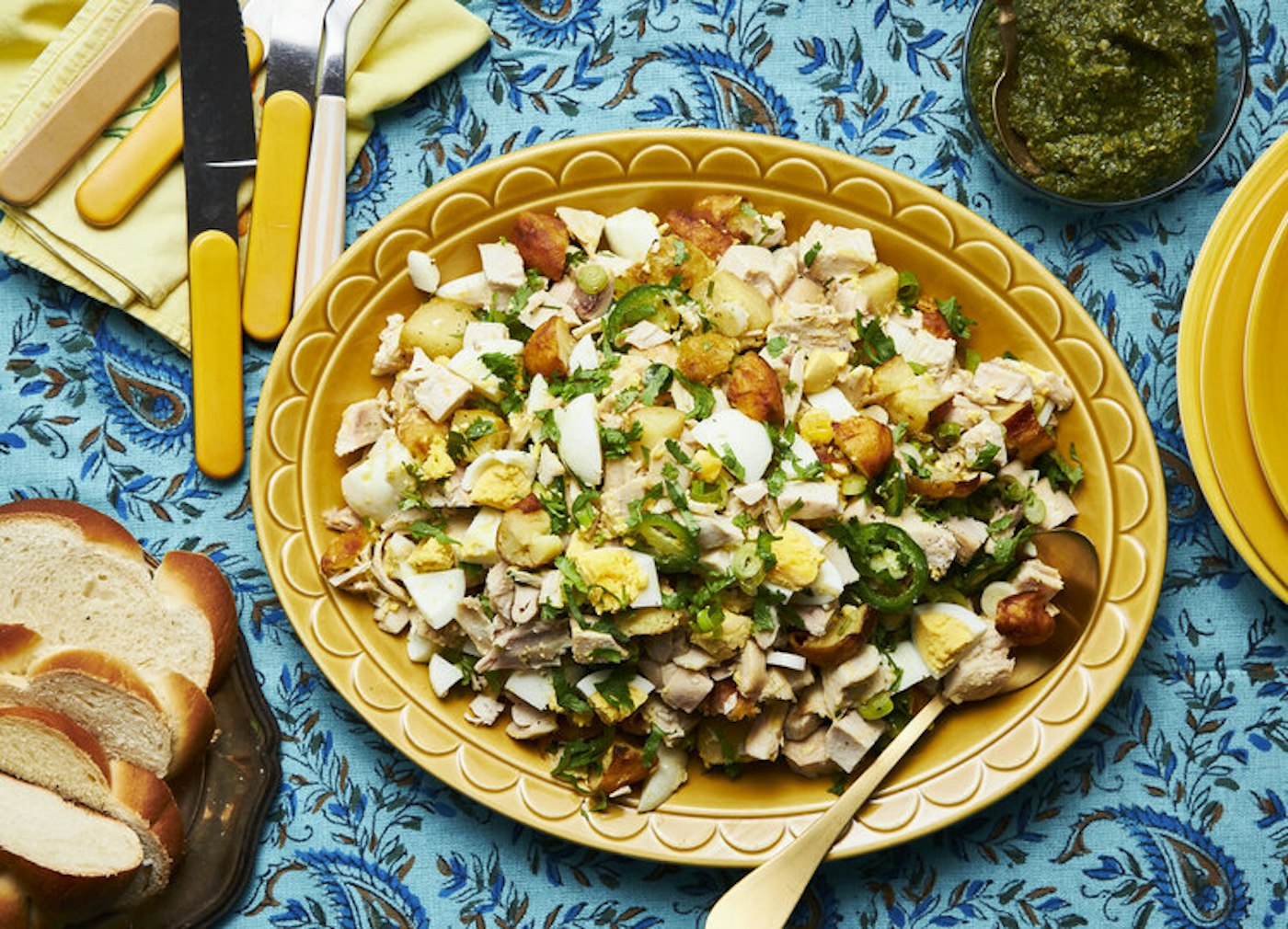 There was chicken with bamboo and coconut, potatoes fried with turmeric called aloo makala, stuffed tomatoes and onions, and rice pilau made fragrant with cardamom and cinnamon and turned golden with turmeric. With leftovers on some Saturdays, the potatoes were repurposed to make an elaborate Shabbat salad. Added to the mix were chicken, hard boiled eggs, green onions, chili, and cilantro, served with halba, a sauce made with fenugreek, ginger, and cilantro. Today, this dish is reserved for special occasions in Elli’s family.